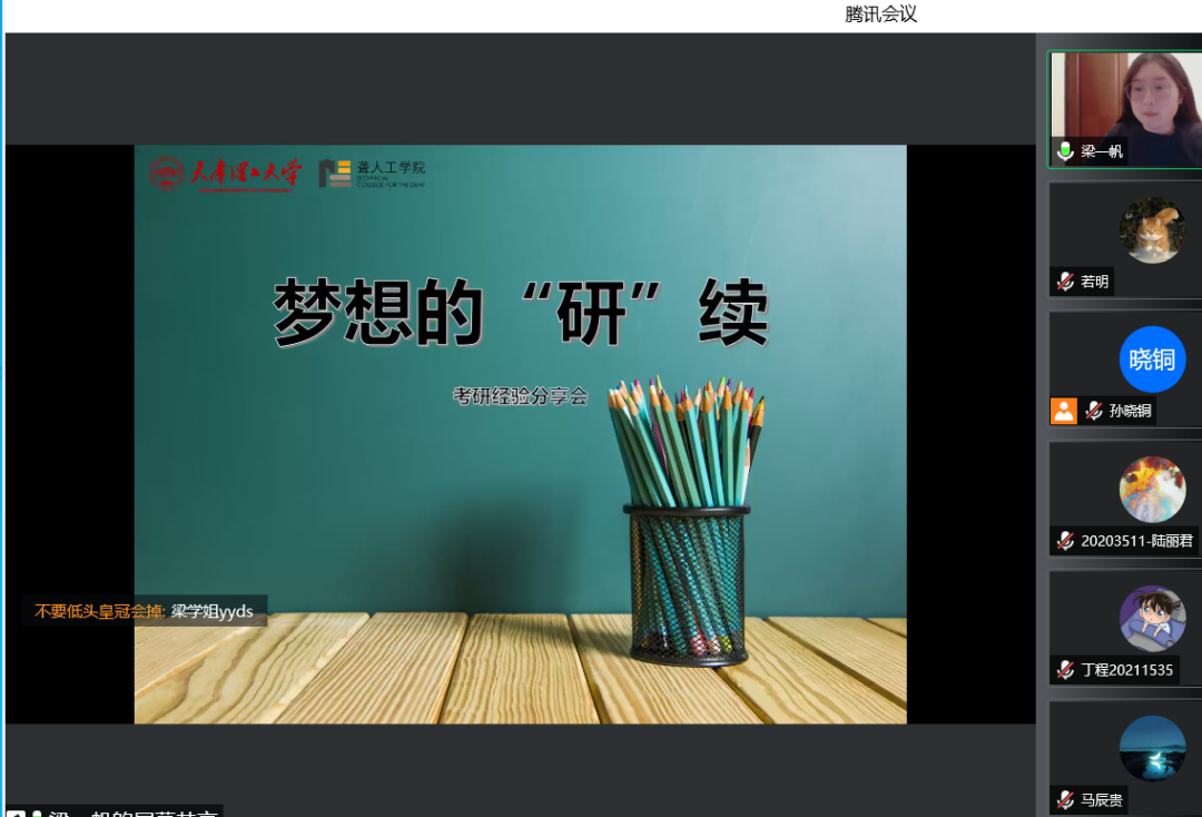 为巩固深化学院学风建设成果,进一步激发员工的学习热情,帮助学子做好学业规划,深入了解考研信息,明确考研目标,掌握考研技巧,5月6日晚,永利3044noc举办第三场线上青春梦想领航人之“职”面未来经验分享会,邀请学院分管研究生工作的副经理李强老师、2020级艺术(研)专业梁一帆、2021级电子信息(研)专业蔡佳良为主讲人,校内外300余名师生参加。